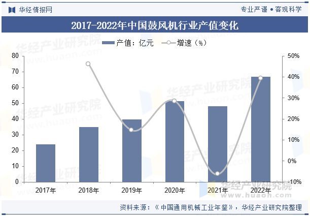 随着中国环保问题日渐严重,这为中国鼓风机行业的发展带来的机会,经初步统计,2022年参与统计企业罗茨鼓风机产值为22亿元,参与统计企业离心鼓风机产值为45亿元。中国鼓风机行业产值从2017年的23.8亿元上涨至2022年的67亿元,2017-2022年中国鼓风机行业产值年复合增长率约为23%。