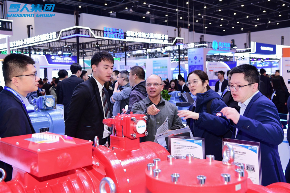 2026年中国制冷展现场,“中国红”与“雪人蓝”构成的展品方阵格外吸睛——“中国红”聚焦雪人集团重点推出的工业热泵板块,“雪人蓝”则覆盖冷冻冷藏全系列产品,形成了多场景、多工况的全品类产品矩阵,全方位展现企业技术实力。